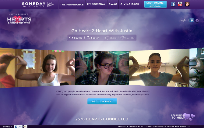 The first phase was Hearts the Across the Web a way to raise awareness for the more altruistic motivation behind Someday, raising donations for Pencils of Promise. We let Justin and his band of Beliebers get together to connect their hearts (his universal symbol of fan appreciation) in an effort to create the world's biggest digital chain, simultaneously raising awareness for the fragrance and his favorite charity.