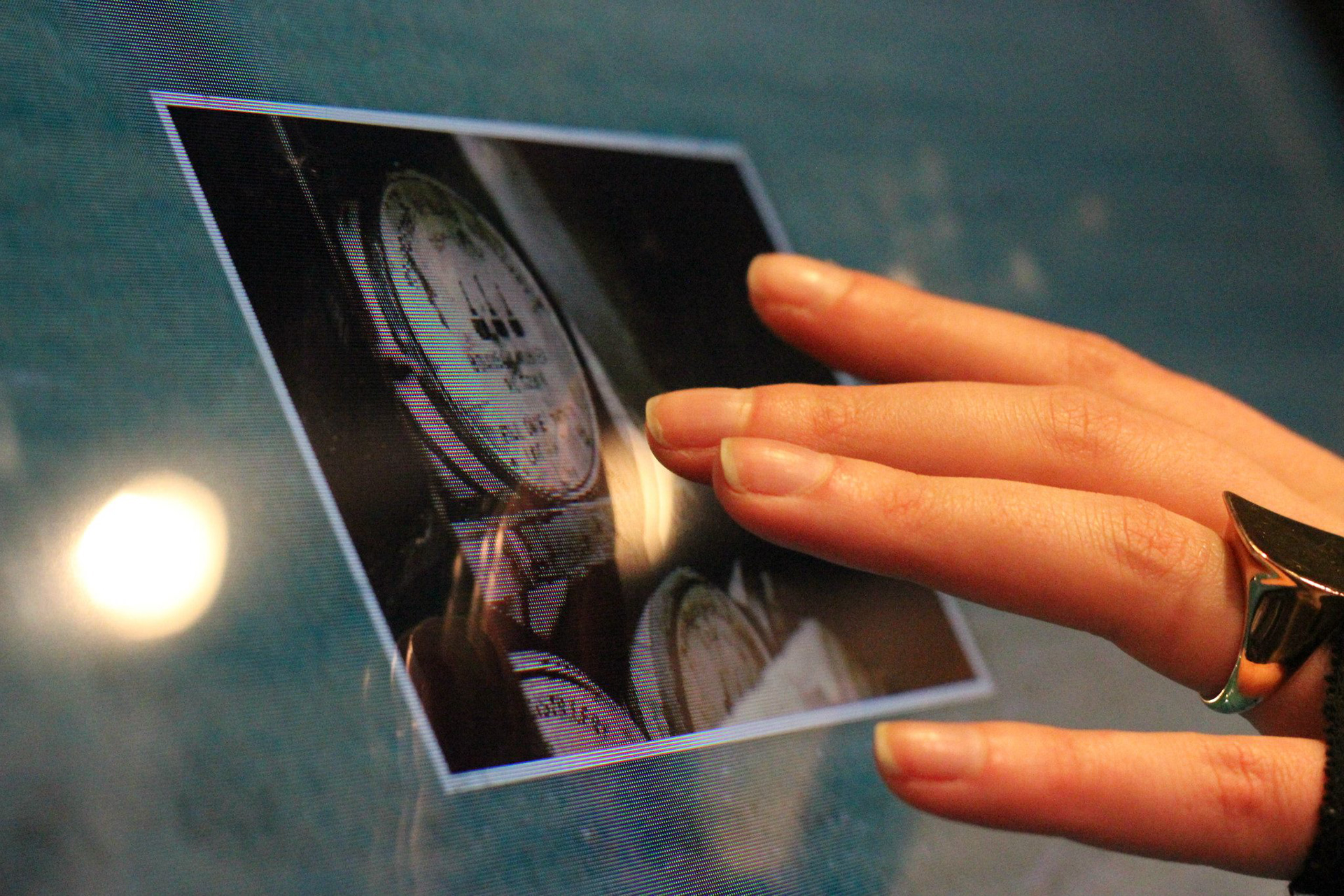 The physicality of the installation was designed to reflect the idea of a wood beam from the ceiling of the building being sliced crosswise to reveal the digital “rings” of history behind the Woodford Reserve brand.