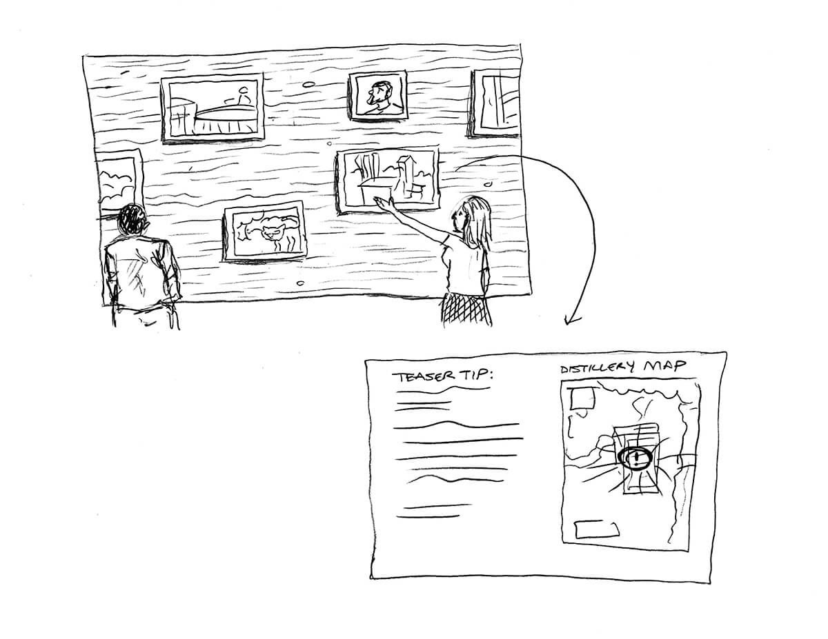 The physical digital installation was a collaboration between myself, the visual design team and in-house industrial design team and features a large touch screen display where visitors can gesturally drag and open floating postcards to learn more about the distillery while they wait for an on-site tour. Visually we created a rich look that speaks to the history of the distillery and an icon system to represent flavor nuances of the spirit.